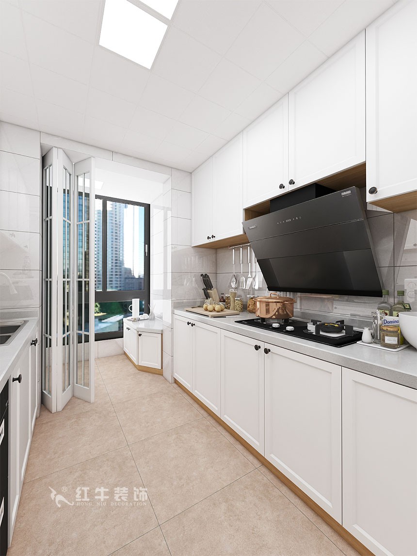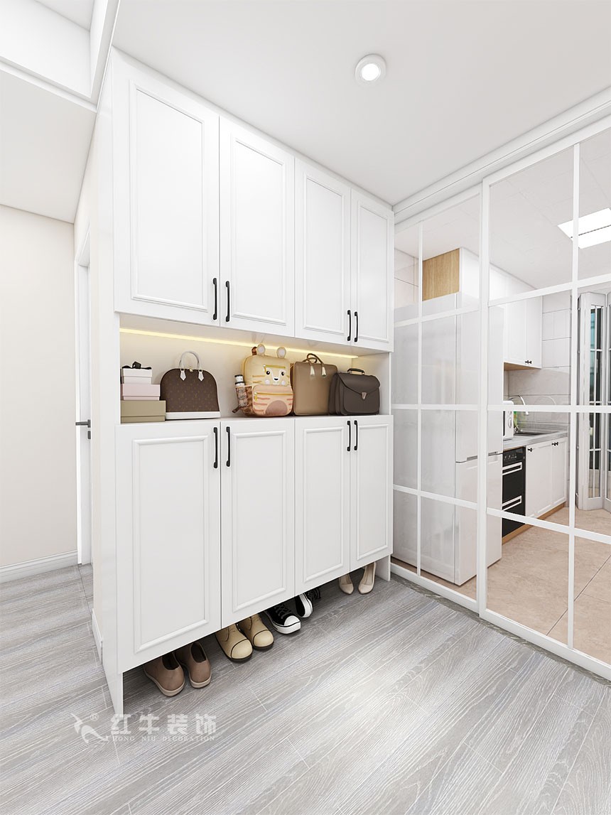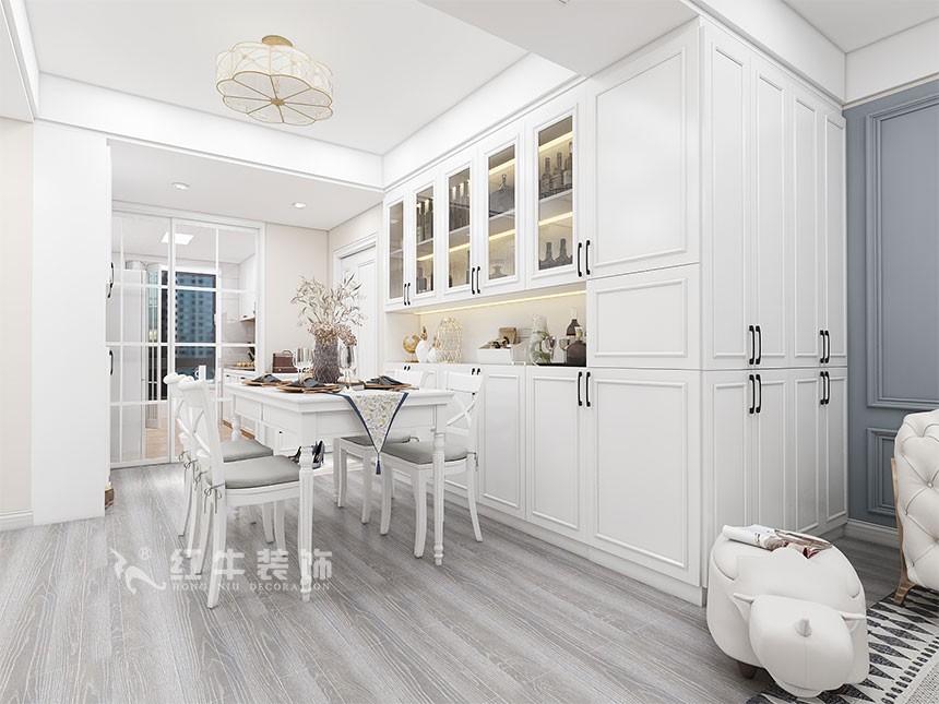 業(yè)主是一家三口居住,整體的風格最終確定為簡歐風格,考慮到南邊陽臺需要洗曬,利用北陽臺作為了吸煙區(qū),平時可以和廚房一起使用,吸煙時關上透明的折疊門,合理的利用了北陽臺。關于儲物空間,客廳比較大,利用了客廳的空間做了一些儲物空間。