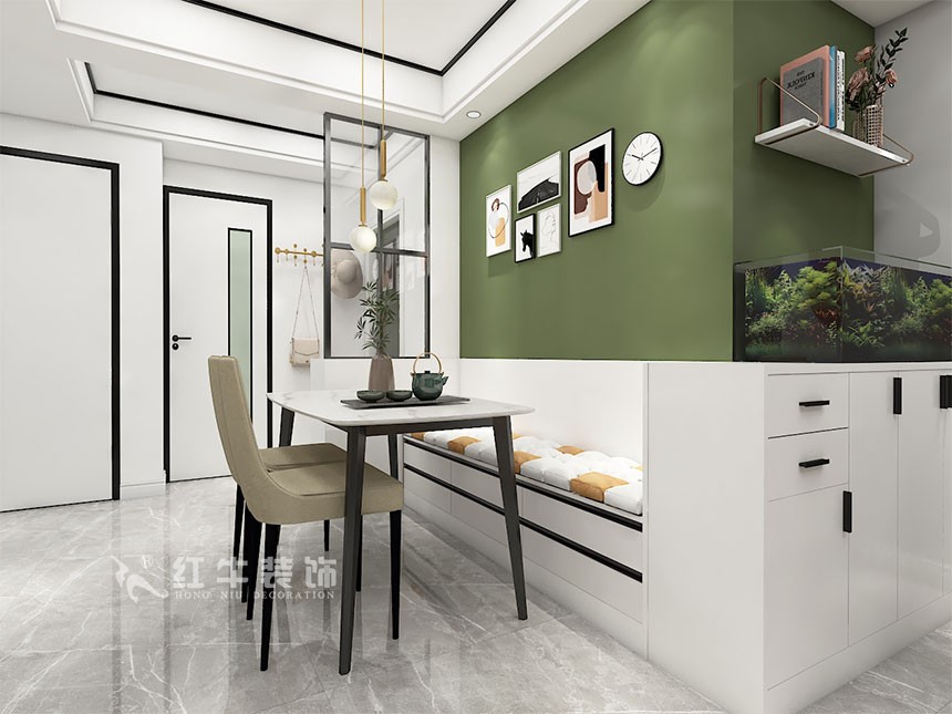 本案設(shè)計(jì)顏色對比鮮艷,結(jié)構(gòu)比較好,沒有太大改動(dòng)。餐廳選用卡座配以活動(dòng)餐椅相結(jié)合,有效利用空間,增加儲物的位置。延伸柜體滿足客戶喜歡養(yǎng)魚的習(xí)慣,墻面適當(dāng)幾處調(diào)色漆的點(diǎn)綴,讓空間瞬間變得特別??蛷d無主燈的選用,光源變得柔和,靈動(dòng),一看就知道是年輕人的居所。
