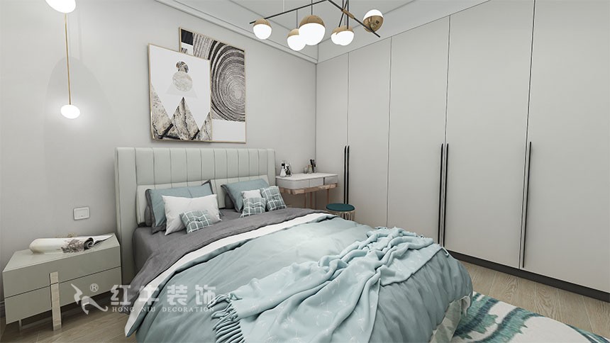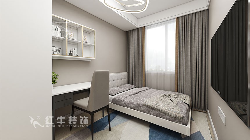 整體風(fēng)格簡約,白色和淺灰色營造出溫馨的生活氣息,次臥室設(shè)計了組合柜,既有學(xué)習(xí)的區(qū)域同時也兼顧了休閑空間。