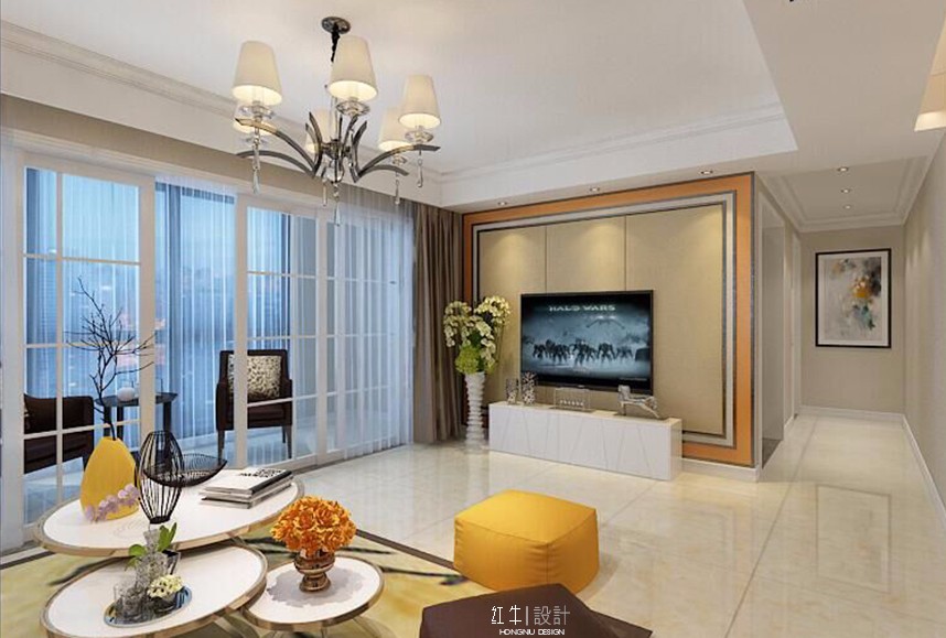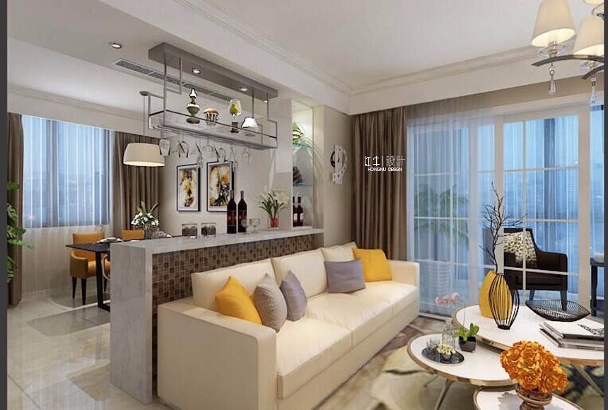 此案設(shè)計(jì)運(yùn)用了石材、不銹鋼、硬包、馬賽克等材質(zhì),通過(guò)不同材質(zhì)帶來(lái)的質(zhì)感體現(xiàn)人們對(duì)生活的態(tài)度及品質(zhì)的追求。布藝沙發(fā)、金屬包邊的茶幾、背景墻局部橙色的跳色,顯得整個(gè)俏皮但又不缺乏生活氣息的居所。