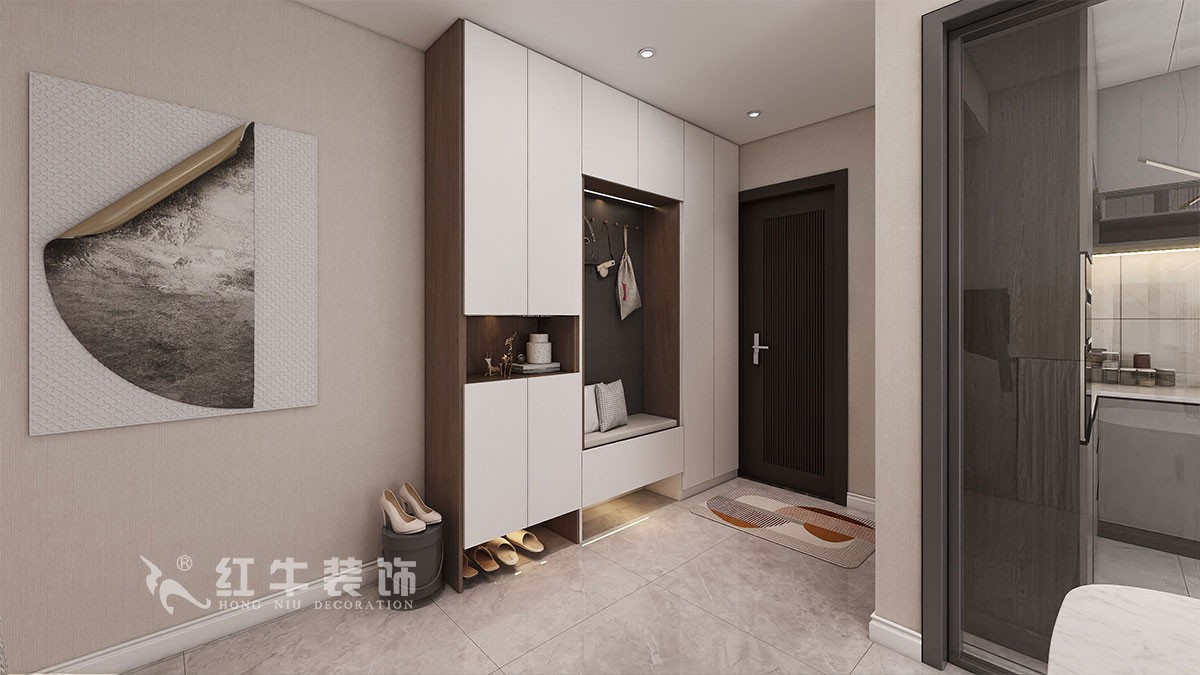 入戶墻體處做了一組組合柜既不影響進(jìn)門,又滿足進(jìn)門儲(chǔ)藏開(kāi)間。
