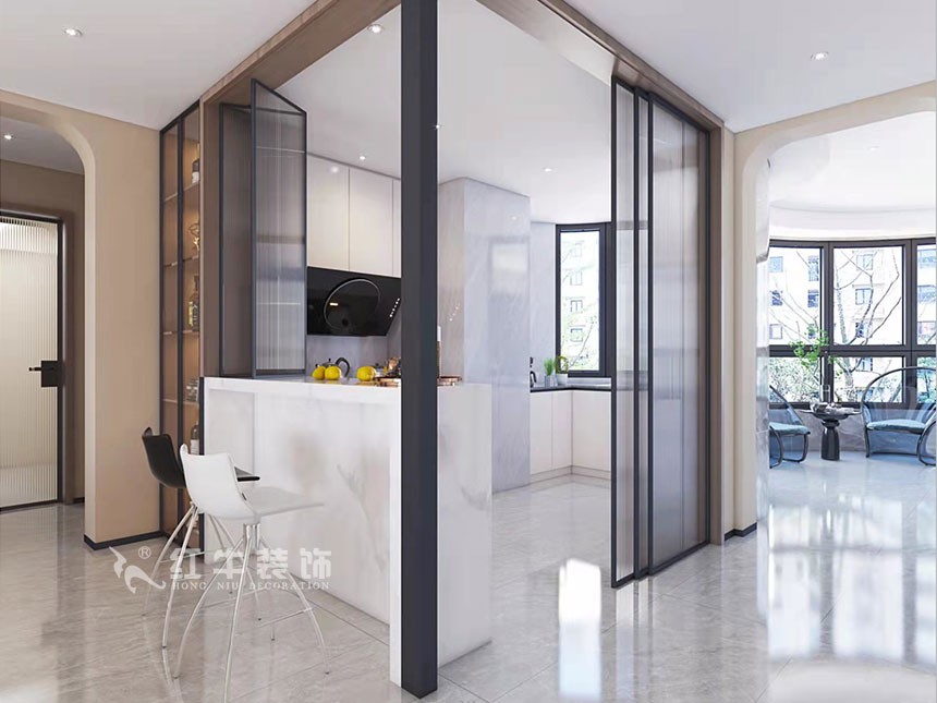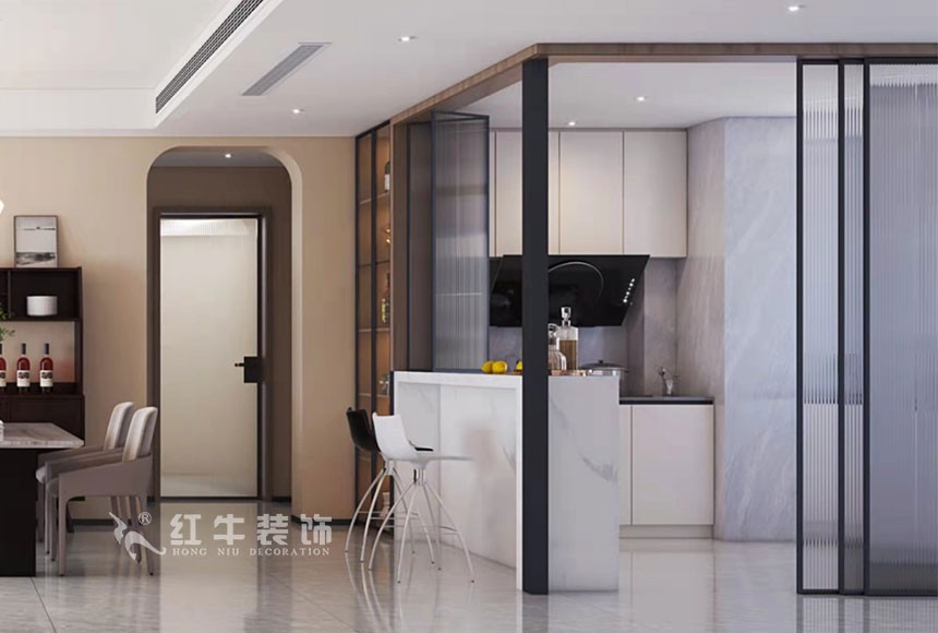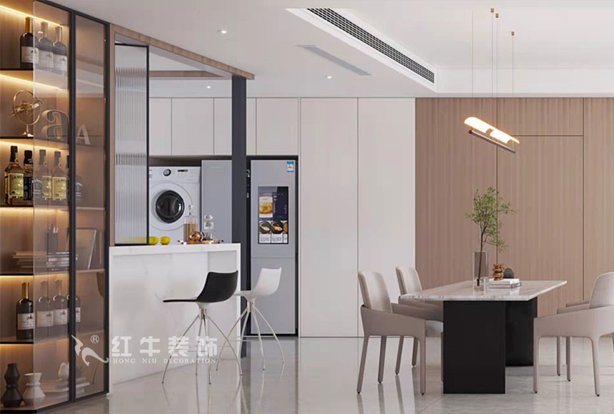 戶型方面尊重業(yè)主的意見,沒有過多調整,保留兩個衛(wèi)生間滿足同時使用的需求,減少主衛(wèi)面積打造屬于業(yè)主的衣帽間,整排的收納衣柜滿足業(yè)主的儲物需求;在餐廚空間設計上,打通廚房與餐廳的隔墻,增設一個吧臺,解決廚房窗戶狹小的問題,讓整個空間更加通透,同時增加設計的趣味性。