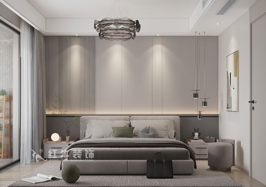 3、主臥延續(xù)了極簡風(fēng),沒有過多裝飾的床頭背景和簡單的吊線燈,整體的家具色彩搭配和諧也是用了低飽和度色和原木色的結(jié)合。